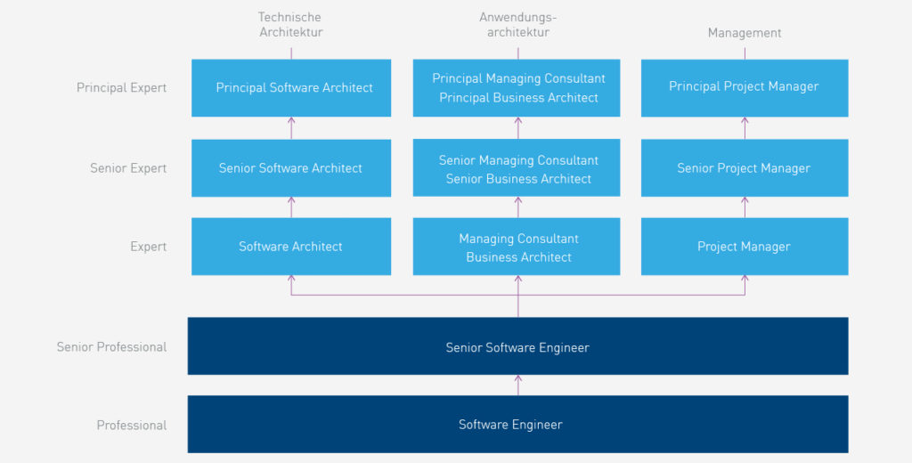 Nach dem Senior Software Engineer unterscheiden wir drei Entwicklungspfade: Software Architect (T-Pfad), Managing Consultant/Business Architect und Project Manager. Innerhalb dieser Stufen unterscheiden wir ebenfalls nochmal in Expert, Senior Expert und Principal Expert.